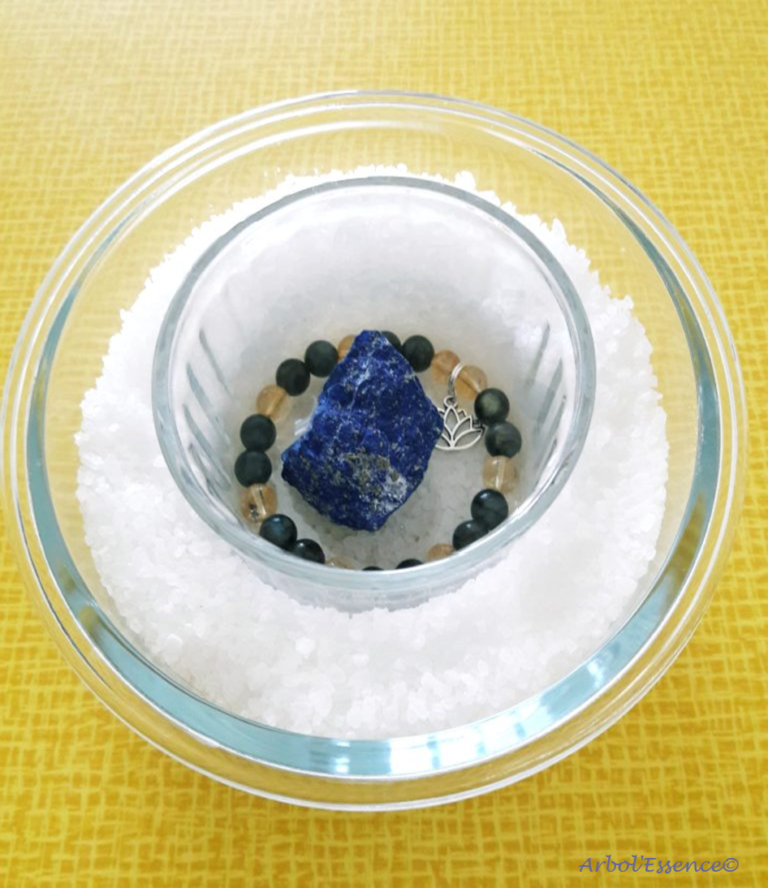 Avec du gros sel : c'est une des méthode les plus efficace. Mettez du gros sel de cuisine dans un récipient, mettez un linge en cotton (essuie de cuisine propre par exemple) ou un simple morceau d'essuie-tout pour que les pierres ne soient pas en contact direct avec le sel. Veillez à ce que vos pierres ne se touchent pas. Vous pouvez mettre vos bracelets, pendentif, pierres polies ensemble mais comptez 5x le volume des pierres en sel, plus il y aura de pierres plus il faudra de sel. N'utilisez pas le sel de l'hymalaya ou autre sel onéreux, du simple gros sel de supermarché fera l'affaire. Laissez vos pierres pendant environ 1h30-2h. Retirez-les. Ensuite, jettez le sel en dehors de chez vous, ne pas le toucher ni le réutiliser. Vous pouvez aussi utiliser un plus petit récipient en verre que vous placez dans le sel comme sur la photo.